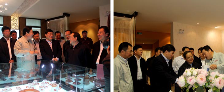 2012年4月6日江西省人民政府省長(zhǎng)鹿心社一行在市委書記鄧保生、市長(zhǎng)劉昌林等省市領(lǐng)導(dǎo)的陪同下來(lái)我司視察工作,鹿心社省長(zhǎng)一行參觀了工廠生產(chǎn)車間、國(guó)瓷館,詳細(xì)了解了公司的生產(chǎn)運(yùn)營(yíng)情 況并對(duì)公司產(chǎn)品贊不絕口。視察期間,鹿心社省長(zhǎng)對(duì)公司給予了高度評(píng)價(jià):“你們公司為景德鎮(zhèn)爭(zhēng)了光,為江西爭(zhēng)了光,為國(guó)家爭(zhēng)了光。"并希望公司能牢牢抓住精品路線,抓住高端市場(chǎng),搞活機(jī)制,繼續(xù)做的更大更好。