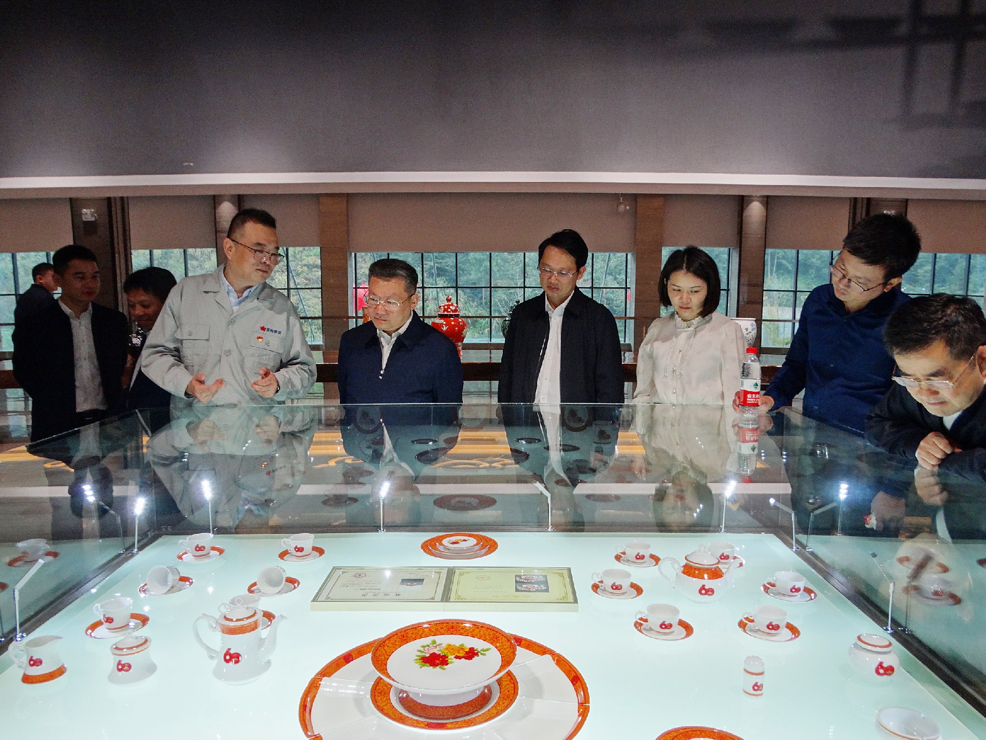 在國瓷館,胡軼向陳澎一行講解國瓷館內(nèi)的基本情況和產(chǎn)品特色。大家一路走一路看一路聽,胡軼向重點介紹了“新中國成立60周年國慶慶典天安門觀禮臺專用瓷”、“‘瀛臺夜話’接待外國元首用瓷”、“古典園林”、“首長專列用瓷”等。一個個國瓷故事和工藝細節(jié),引得眾人贊嘆不已。陳澎還仔細詢問了企業(yè)生產(chǎn)經(jīng)營、對外貿(mào)易等情況。